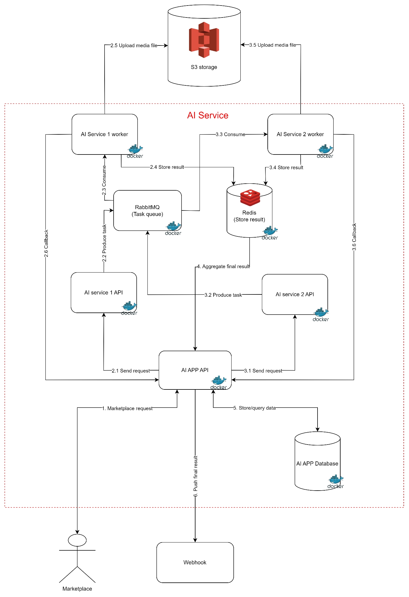 With a basic AI problem: AI service will require a minimum of 6 components (docker container). The number of components will increase when the AI problem is complex and needs to be divided into multiple stages for processing
