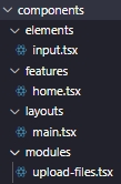 Components folder, which contains the smallest unit as elements to larger such as module, layouts, features