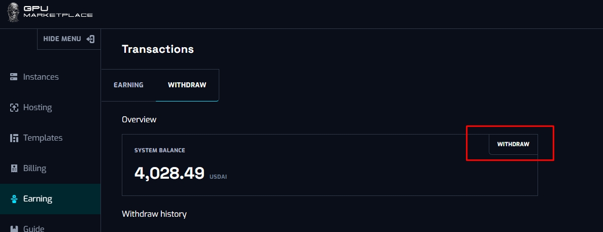 Step 1: Navigate to Earning on sidebar, click Withdraw