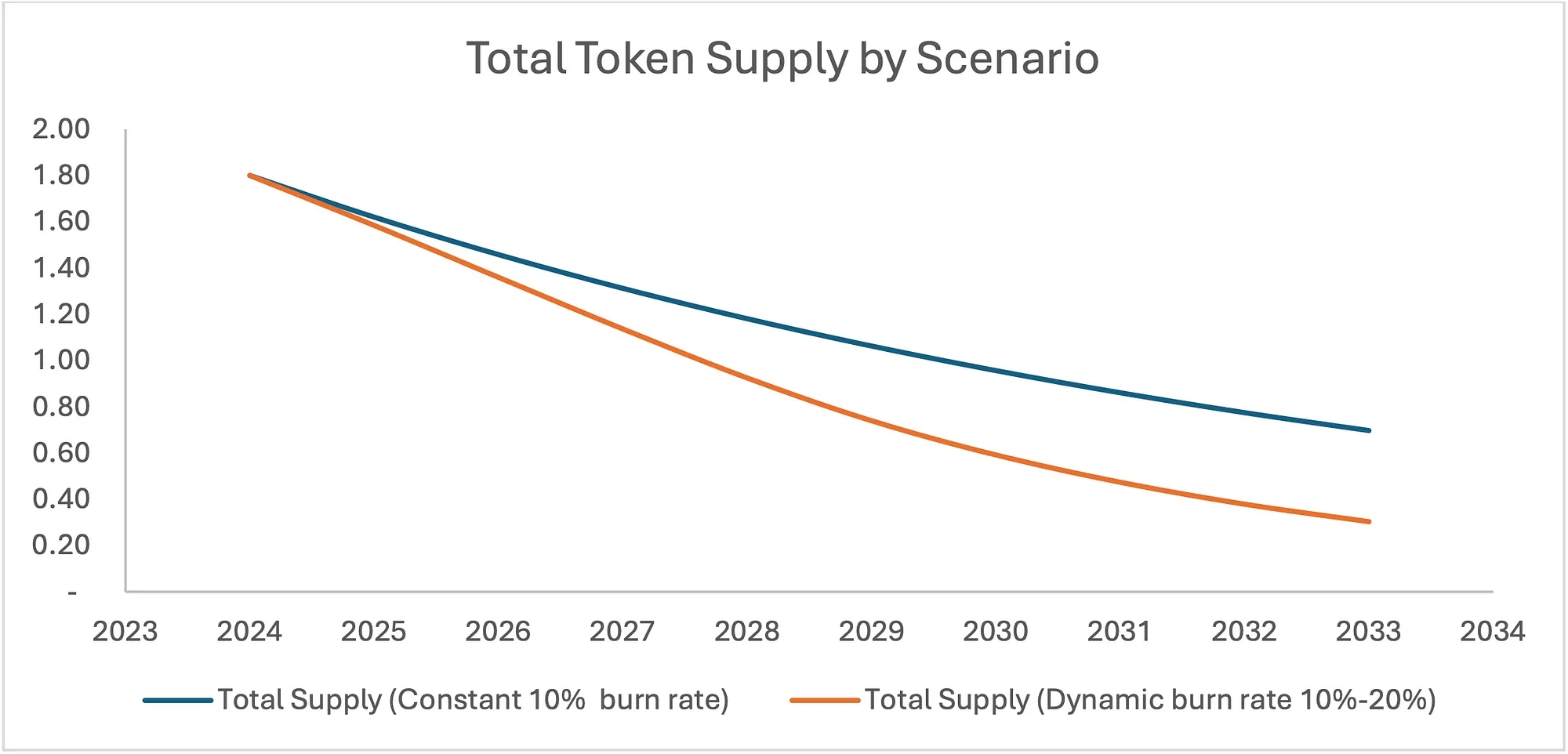 供应减少:交易增加导致代币销毁频率更高,从而逐步减少总供应量。