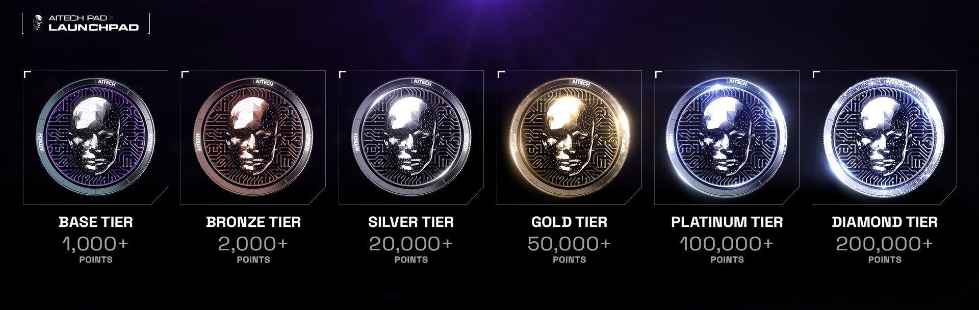 AITECH Pad 提供 6 个等级:基础、青铜、白银、黄金、铂金和钻石。 要获得等级,用户必须质押 AITECH 代币。质押池提供增强池,旨在倍增您的质押金额并提升您的等级。然而,之前已在可用池中质押的用户也有资格根据质押金额获得相应等级。